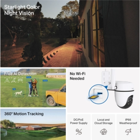 1080P Full HD: Reveals sharp images and vivid details with 1920 × 1080 pixels, 360° All-Round Protection: Provides 360° horizontal & 130° vertical viewing range, eliminating blind spots, Free AI Detection: Smart AI identifies people, pets, and vehicles, sending instant notifications through the Tapo app, No Wi-Fi, No Limit: Connects through 4G LTE networks, ideal for places where constant Wi-Fi is not available, Starlight Color Night Vision: Captures vibrant images in low light up to 20 meters away, IP66 Weatherproof: Works well in rain, dust, and heat, offering excellent waterproof and dustproof performance for outdoor scenarios, Sound and Light Alarm: Craft your own audio alarm to deter unwelcome intruders and tailor the intensity of the dual spotlights, Local and Cloud Storage: Save all your important moments to a microSD card (up to 512GB) or subscribe to Tapo Care for cloud service, Dual Mode Flexibility with 4G or PoE: Power your camera with a DC adapter or Ethernet cable featuring PoE technology, CE, NTRA, RCM, VCCI, NCC, BSMI, ROHS