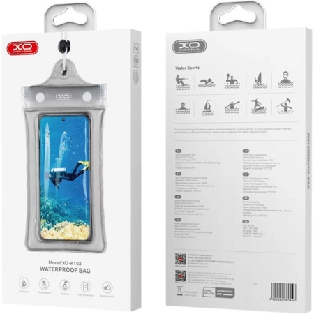 XO-KT03 Case Waterproof PVC Bag for Mobile Phones. Inflatable model with zipper and cord, suitable for phones up to 7 inches. Material: 0.25 PVC (inflatable edge), Size: 10 x 23 cm, Waterproof: iPX8, Applicable: under 7 inches, Closure: Closure with three zippers.